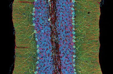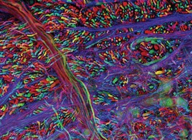 用暗視場(chǎng)顯微鏡觀察的復(fù)雜的大腦 復(fù)雜的大腦:美國(guó)加利福尼亞大學(xué)圣迭戈分校的托馬斯•迪林克(Thomas Deerinck)利用雙光子顯微技術(shù)(2-photon microscopy),拍攝到了一塊僅有400μm厚的小鼠小腦組織樣本的精細(xì)顯微結(jié)構(gòu)(見上圖),其中綠色的是浦肯野神經(jīng)細(xì)胞(Purkinje neuron),紅色的是神經(jīng)膠質(zhì)細(xì)胞(glial cell),藍(lán)色的則是神經(jīng)核。